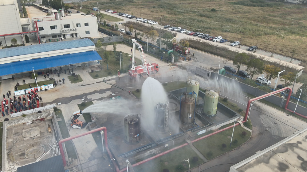 随后,化工企业灭火救援综合实战演练正式开始。演练模拟湖南阿斯达新材料有限公司因雷击导致储罐通气阀故障引发甲醇起火的紧急情况。火灾发生后,企业立即启动应急预案,拨打119报警,组织人员疏散,利用厂区消防设施开展初期火灾扑救。市消防救援队伍接警后迅速响应,采用无人机、有毒(可燃)气体探测仪等装备开展现场侦察,科学划定危险区域并设置警戒,出动德国曼城市消防主战车、消防排烟灭火机器人等新型装备进行灭火。