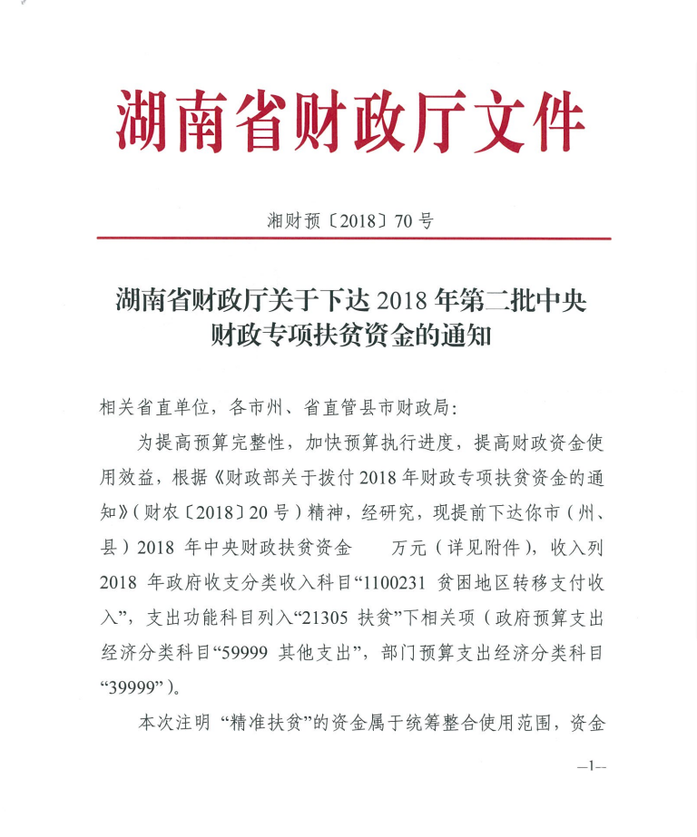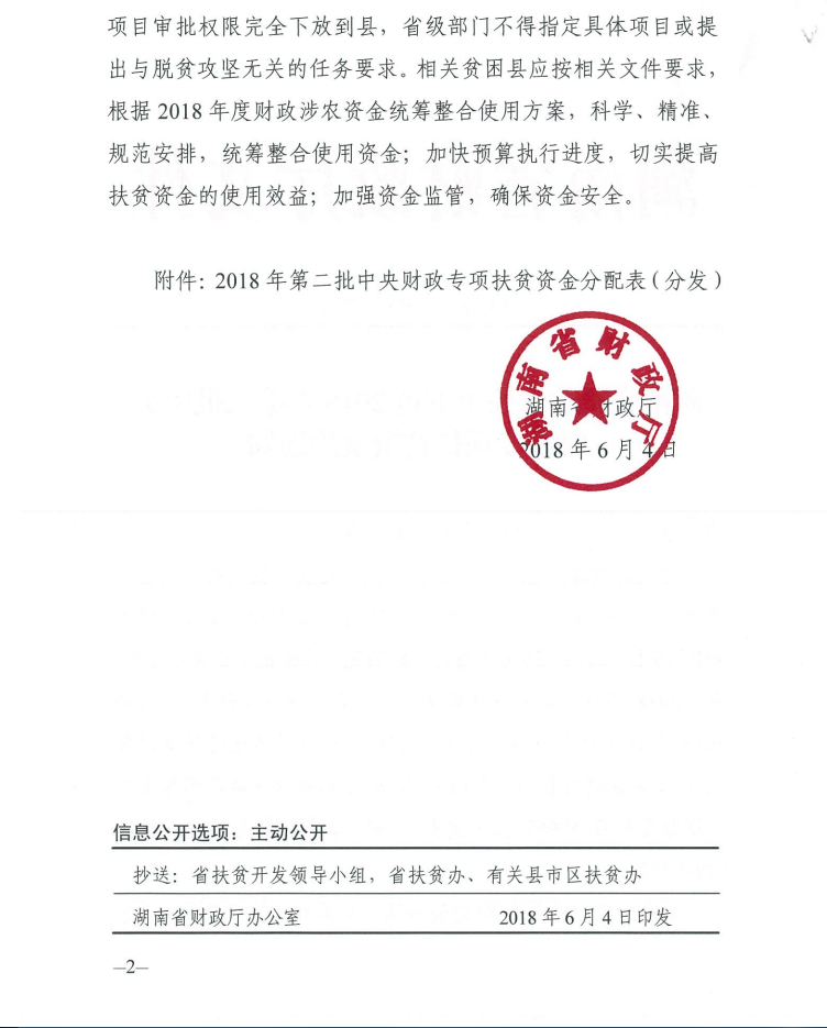 湖南省财政厅关于下达2018年第二批中央财政专项扶贫资金的通知