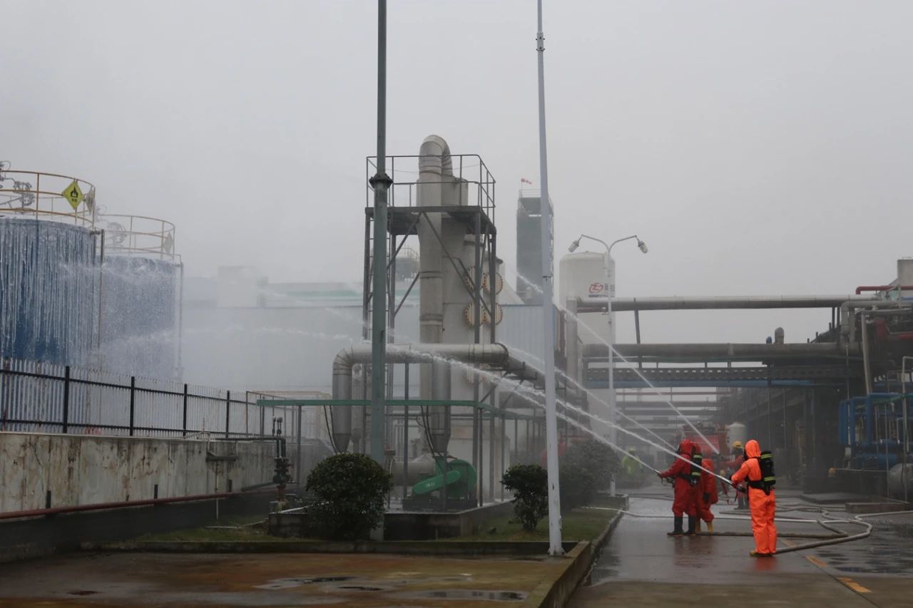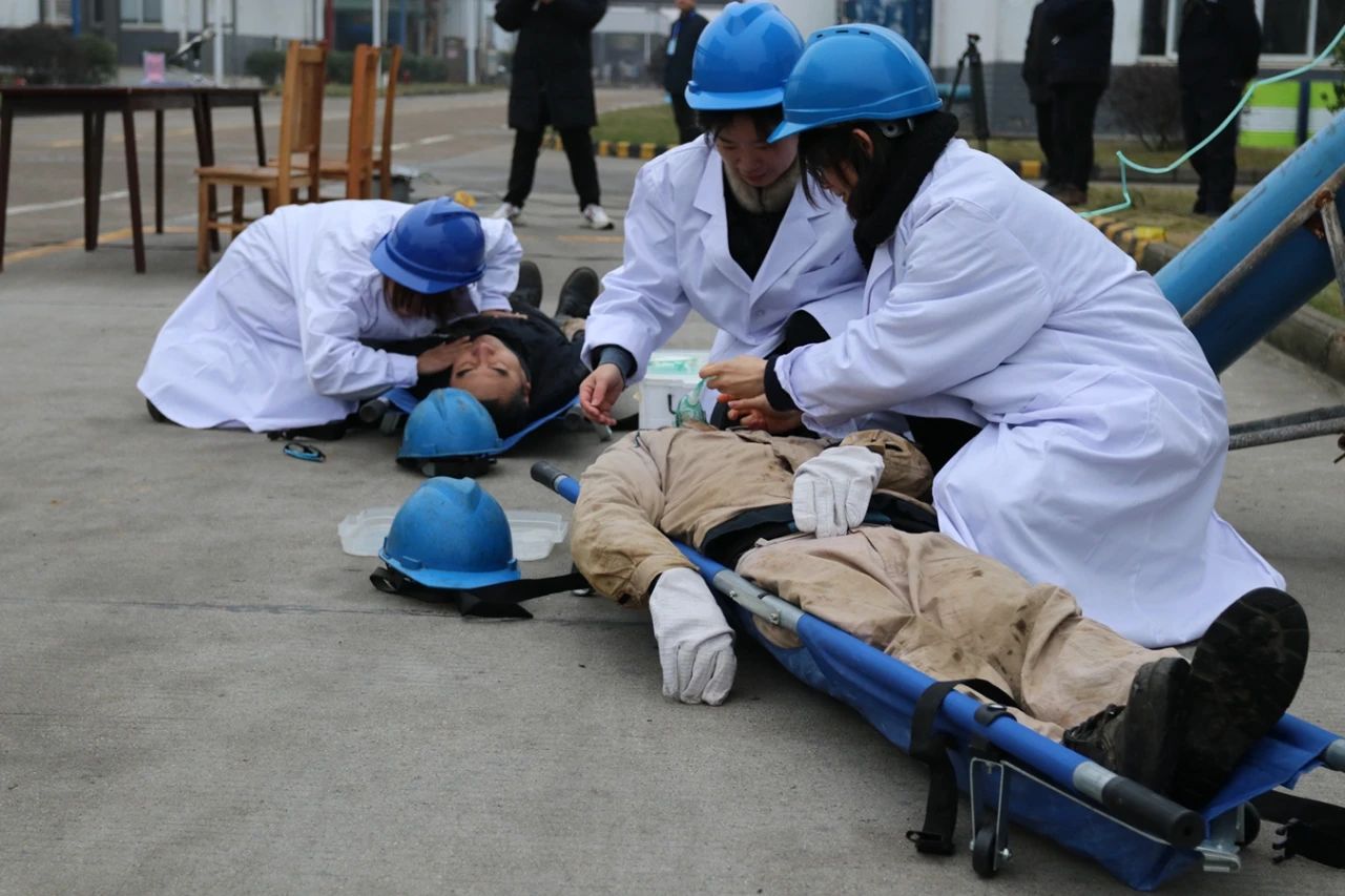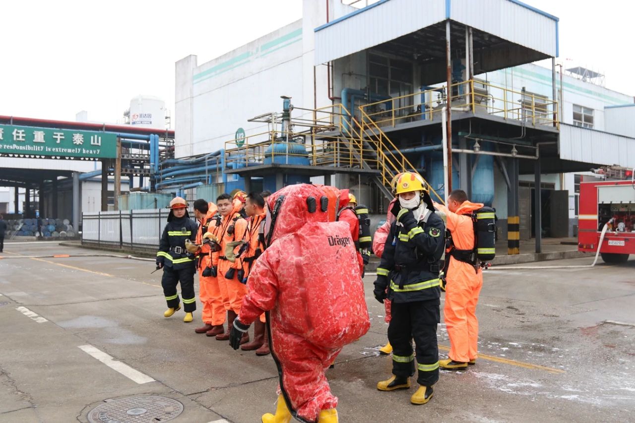 演练模拟该公司原材料仓库主控室甲苯报警器预警,罐区甲苯储罐法兰垫子部位发生泄漏,员工在处置时发生静电着火,2名处置人员中毒被困。公司发现险情后立即启动应急救援预案,拉响警报,公司各应急救援分队迅速集结,公司现场总指挥刘喜华带领专家组、消防分队、抢险抢修防化分队、医疗分队赶往现场进行救援,开展应急警戒、组织人员疏散、初期火灾扑救等工作,并及时向市119消防指挥中心,市应急指挥中心报告,请求协调应急救援力量。市应急管理局立即核实向分管市领导报告,经高市长同意,启动《津市市市危险化学品安全生产事故应急预案》。紧急出动公安、消防、安监、卫生、环保、宣传等部门立即赶往火灾现场进行救援。各事故救援组在现场指挥部的指导下协调配合、整体联动,通过开展现场救援、消防灭火、引导舆情等,在半小时内成功处置了该事故。
