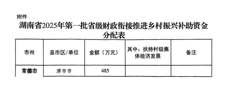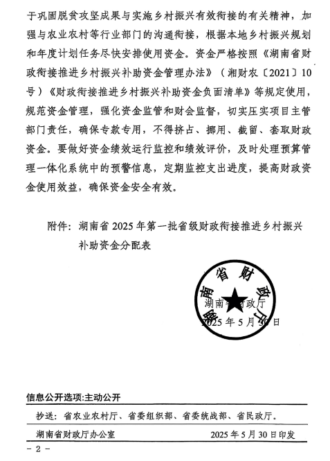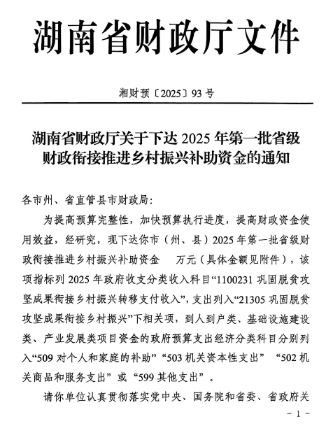 湖南省财政厅关于下达2025年第一批省级财政衔接推进乡村振兴补助资金的通知(湘财预[2025]93号)
