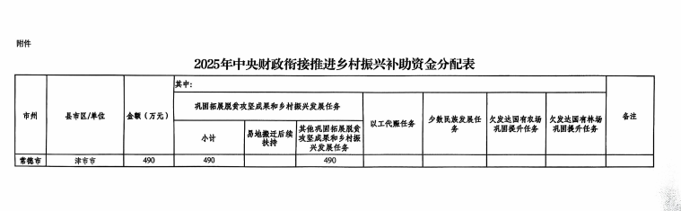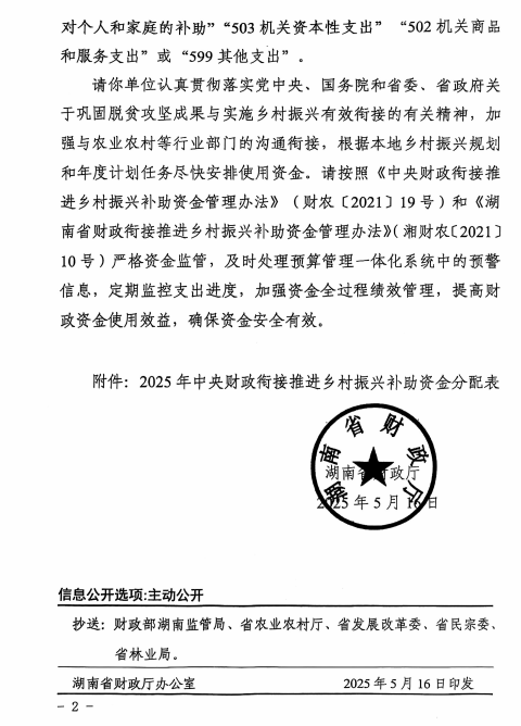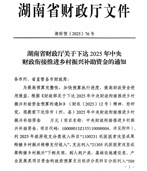 湖南省财政厅关于下达2025年中央财政衔接推进乡村振兴补助资金的通知(湘财预[2025]76号)