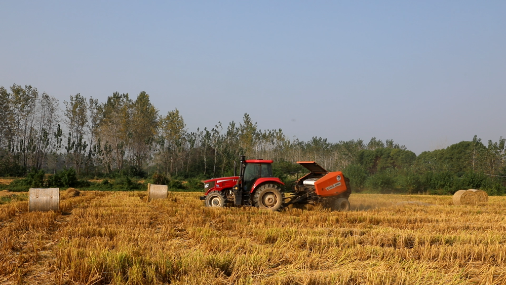 在汪家桥街道澹津社区,水稻种植田里的秸秆清运工作正有序开展。散落在田地上的秸秆经过搂草机归拢作业,再由打捆机进行压缩打包成捆,最后运往就近的秸秆收储中心。