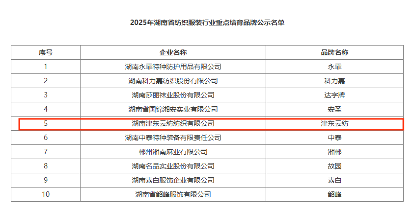 湖南津东云纺纺织有限公司成功入选2025年湖南省纺织服装行业重点培育品牌拟定名单