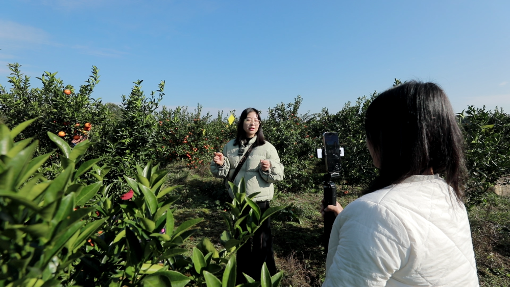 除了果农,果园里还有一支特别的服务队,由当地党员干部组成的直播带货服务团队正在通过线上平台帮助村民销售柑橘。通过直播镜头,直播队员们一边热情地向线上观众介绍“世纪红”柑橘的独特优势,一边实时展示着采摘工人忙碌的身影,让消费者直观感受水果的新鲜与采摘的乐趣。