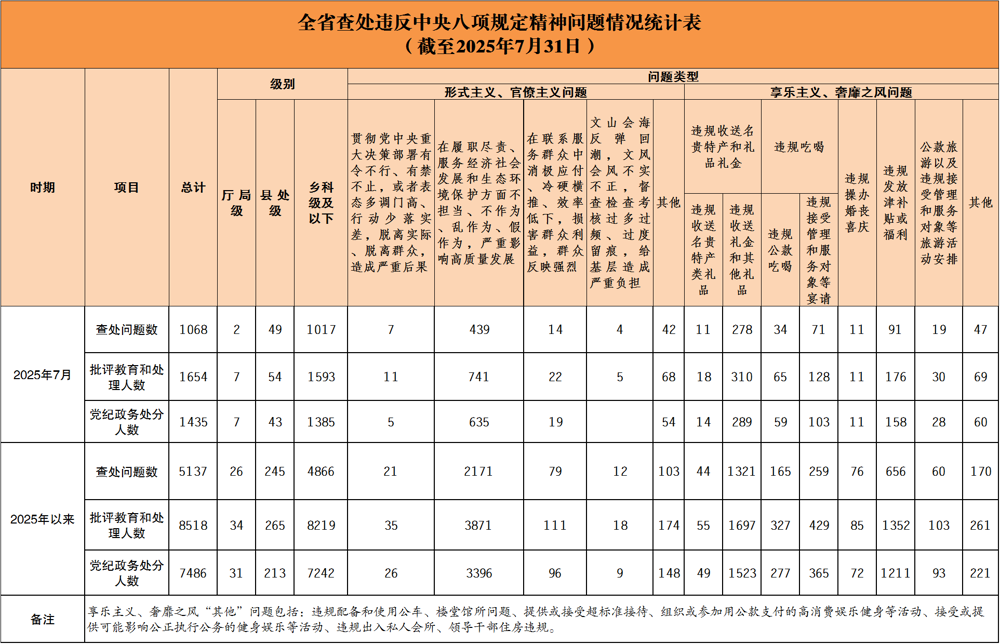 2025年7月,全省各级纪检监察机关共查处违反中央八项规定精神问题1068起,批评教育和处理1654人,其中给予党纪政务处分1435人,占处理人数的86.76%。